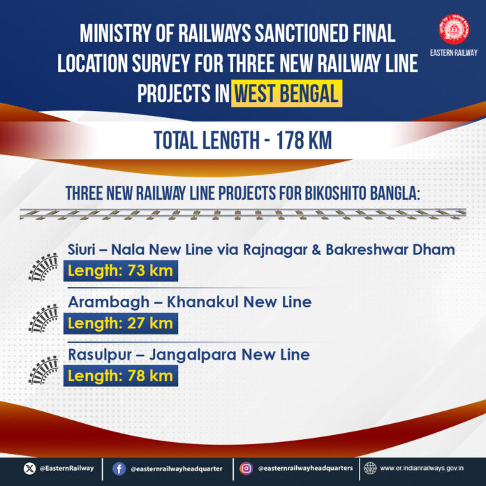 পশ্চিমবঙ্গে মোট ১৭৮ কিলোমিটার দৈর্ঘ্যের তিনটি নতুন রেললাইন প্রকল্পের জন্য চূড়ান্ত লোকেশন সার্ভে অনুমোদন রেল মন্ত্রণালয়ের