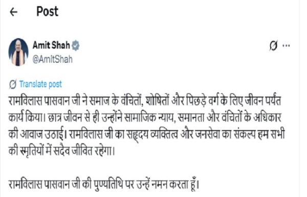 প্রাক্তন কেন্দ্রীয় মন্ত্রী রাম বিলাস পাসোয়ানের প্রয়াণ দিবসে স্বরাষ্ট্র ও সমবায় মন্ত্রী অমিত শাহ-র শ্রদ্ধার্ঘ্য