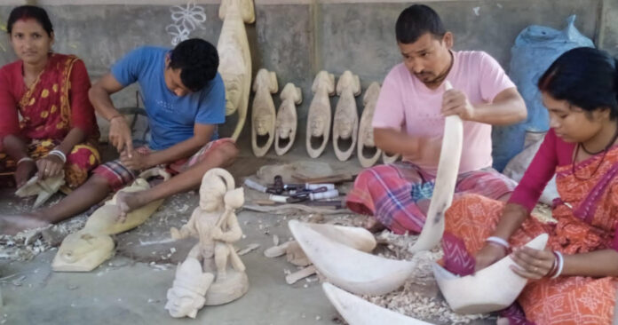 তপন চক্রবর্তী, উত্তর দিনাজপুর: দক্ষিণ দিনাজপুর জেলার মহিষবাথান গ্রাম হস্তশিল্পের জন্য শুধু নিজস্ব জেলায় বিখ্যাত নয়, এখানকার হস্তশিল্প রাজ্য পেড়িয়ে বিদেশের বাজারেও যথেষ্ট সুনাম অর্জন করেছে । রুয়ানগর গ্রামের শংকর সরকার দক্ষিণ দিনাজপুর জেলার মুখা শিল্পের জনক বলেই সবার কাছে পরিচিত। প্রয়াত বিশিষ্ট মুখা শিল্পী শংকর সরকারের হাতেই মহিষবাথান শিল্প সমবায় সমিতির প্রতিষ্ঠা হলেও বামফ্রন্ট সরকারের আমলে এই সমবায় সমিতির গোডাউন কাম ওয়ার্কশপ তৈরি করা হয়েছিল। এক সময় এই শিল্প সমবায় সমিতিতেই কাজ করতো রুয়ানগরের বাসিন্দা টুলু সরকার এবং নন্দীচন্দ্র সরকার। কিন্তু সারাদিন পরিশ্রম করেও সেই ভাবে পারিশ্রমিক না পাওয়ায় এক সময় শিল্প সমবায় সমিতির কাজ ছেড়ে নিজের বাড়িতে দুই ভাই এবং দুই ভাইয়ের পরিবার পরিজন যথাক্রমে পুতুল দেবশর্মা সরকার এবং কবিতা সরকার স্বতন্ত্র ভাবে হস্তশিল্প সাধনায় লেগে পড়েন।
