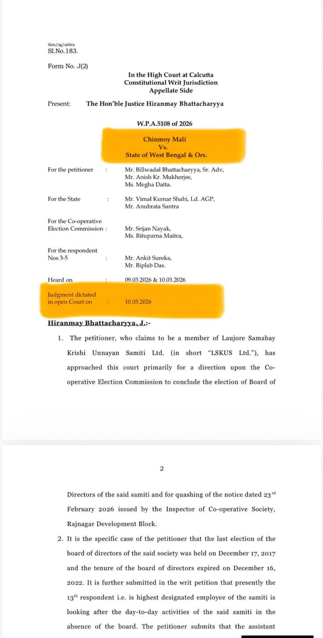 নিজস্ব প্রতিনিধি,সিউড়ি : আগামী চার সপ্তাহের মধ্যে গনতান্ত্রিক পদ্ধতিতে চন্দ্রপুর থানার লাউজোড় সমবায় কৃষি উন্নয়ন সমিতির নির্বাচন করাতে হবে বলে নির্দেশ দিয়েছে কলকাতা হাইকোর্ট । বিজেপির রাজ্য সহসভাপতি জগন্নাথ চট্টোপাধ্যায় বলেন, “লাউজোড় সমবায় সমিতির নির্বাচন রাজ্য পুলিশের সংখ্যা কম দেখিয়ে বারবার নির্বাচন করতে দিচ্ছিল না রাজ্য সরকার । সম্প্রতি একটা কমিটি গঠন করা হয় সমবায় সমিতি চালানো । সেই বিষয়টিকে চ্যালেঞ্জ করে কলকাতা হাইকোর্টের দ্বারস্থ হয় লাউজোড় গ্রামের যুবক চিন্ময় মালী । আগামী চার সপ্তাহের মধ্যে গনতান্ত্রিক পদ্ধতিতে লাউজোড় সমবায় সমিতির নির্বাচন কেন্দ্রীয় বাহিনী দিয়ে করানোর কথা বলে কলকাতা হাইকোর্ট । তখন রাজ্যের আইনজীবী এই নির্বাচন রাজ্য পুলিশ করতে পারবে বলে জানিয়েছে । কলকাতা হাইকোর্টের তত্ত্বাবধানে হবে এই নির্বাচন । আশা করছি নির্বাচনে লাউজোড়ের মানুষ সঠিক পদক্ষেপ নেবে ।”