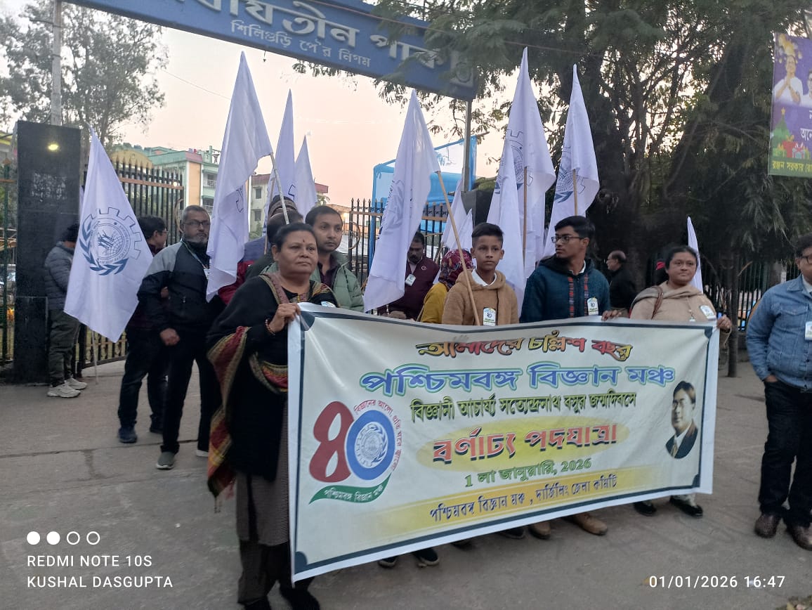 নিজস্ব প্রতিনিধি, শিলিগুড়ি : পশ্চিমবঙ্গ বিজ্ঞান মঞ্চের ৪০ বছর পূর্তি উপলক্ষে পশ্চিমবঙ্গ বিজ্ঞান মঞ্চ দার্জিলিং জেলা কমিটির তরফ থেকে একটি বর্ণাঢ্য শোভাযাত্রা এদিন বের করা হয়। বৃহস্পতিবার বিকেলে বাঘাযতীন পার্ক থেকে ৪০ বছর পূর্তি উপলক্ষে পশ্চিমবঙ্গ বিজ্ঞান মঞ্চ দার্জিলিং জেলা কমিটির তরফে একটি শোভা যাত্রার আয়োজন করা হয়। পশ্চিমবঙ্গ বিজ্ঞান মঞ্চ দার্জিলিং জেলার কার্যকরী সভাপতি তথা রাজ্যের সহ-সভাপতি গোপাল দে জানান ৪০ বছর পূর্তি উপলক্ষে ৩০ দিন ধরে পশ্চিমবঙ্গ বিজ্ঞান মঞ্চের তরফ থেকে রাজ্যের বিভিন্ন জেলা জুড়ে বিজ্ঞান অভিযান চলবে। বিভিন্ন জেলার পাশাপাশি দার্জিলিং জেলাতেও এই অভিযান চলবে বলে তিনি জানান।